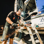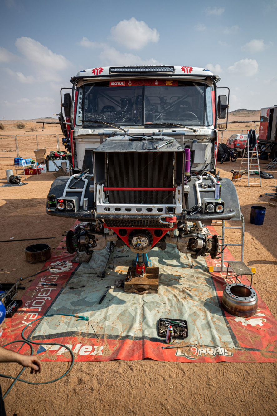 Co se dělo po příjezdu do včerejšího maratonského bivaku v Sakaka? Posádka týmu Big Shock! Racing se v rychlosti ubytovala ve velkém stanu na přistavených matracích a hned se vrhla do práce. Karel, jejich závodní kamion, prošel důkladnou kontrolou. „Zaměřili jsme se na spojovací tyč řízení, která v předchozí etapě dělala neplechu. Rozebírali jsme a znovu skládali jednotlivé části, abychom se přesvědčili, v jakém jsou stavu, ladili jsme i celou geometrii nastavení přední nápravy, opravovali utržený šroub na zadním diferenciálu, který způsoboval lehký únik oleje, měnili pneumatiky…,“ vyjmenovává palubní mechanik David Švanda.