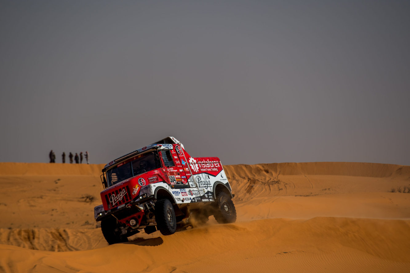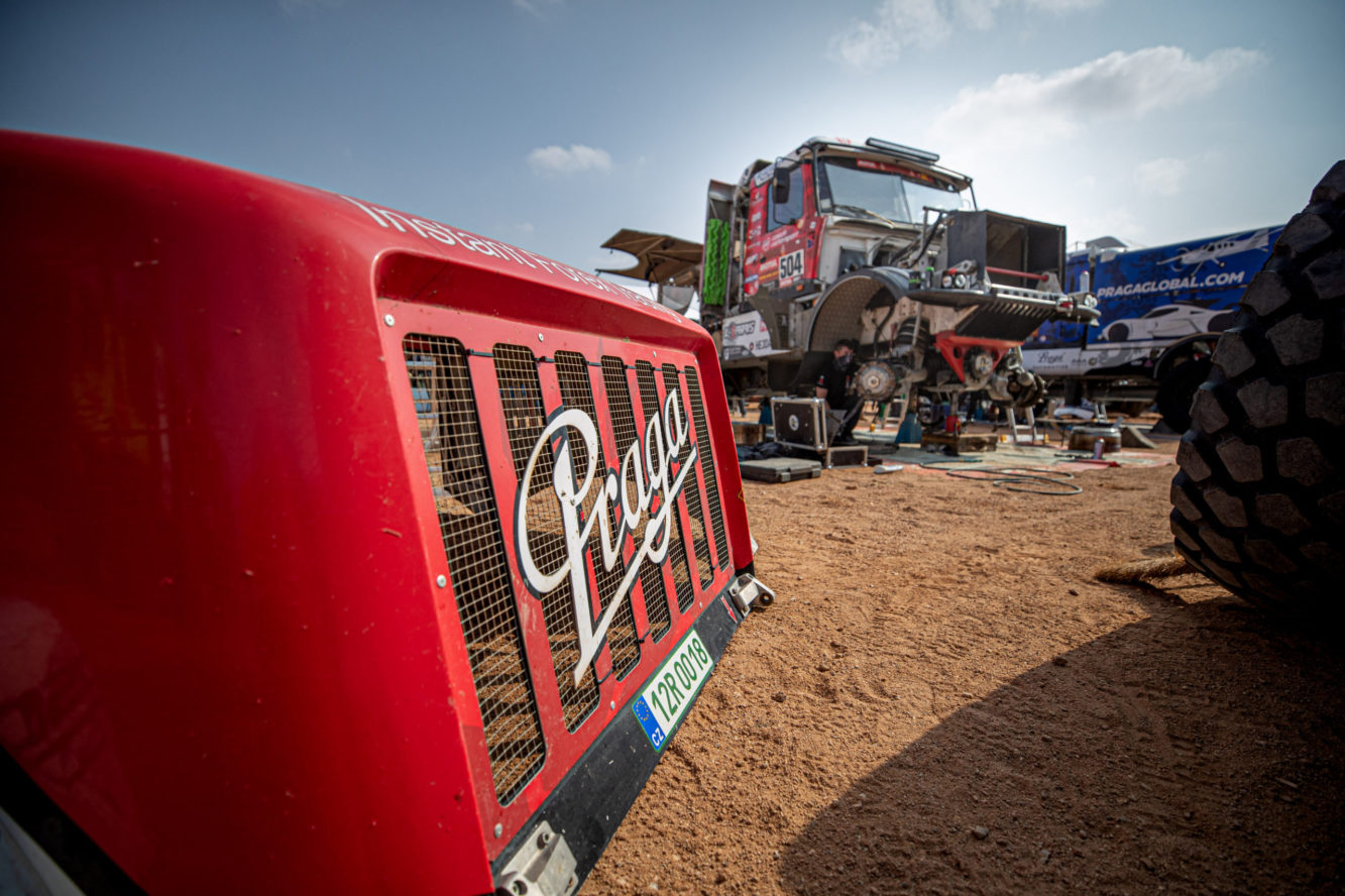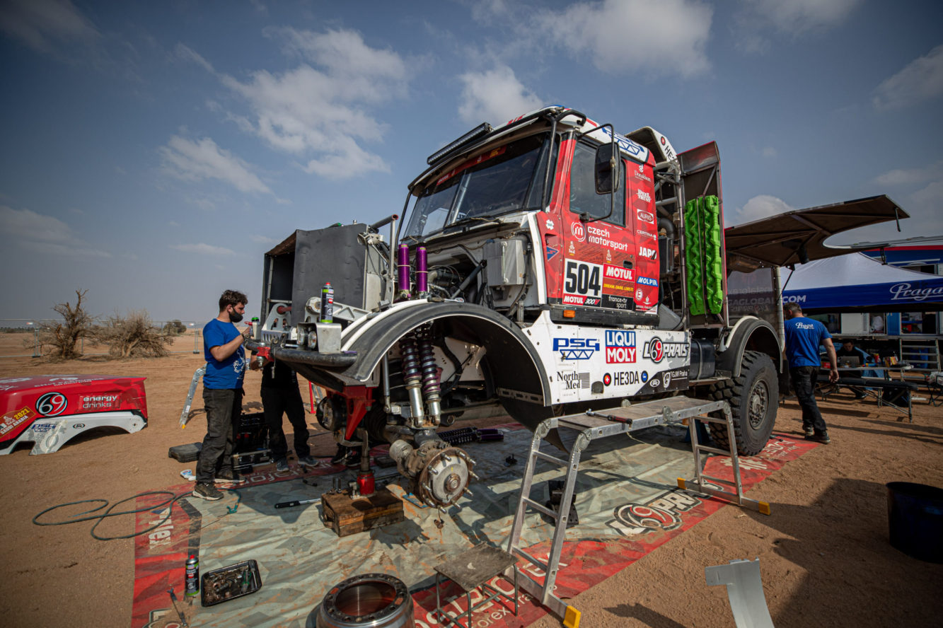 Maratonské etapy, které se jely v neděli a pondělí, uzavřely druhou třetinu Dakaru 2021. Minimálně některým členům Instaforex Loprais Praga Teamu tyto dva dny splynuly v jeden. V bivaku v Sakace, kde posádky musely péči o techniku zvládnout pouze vlastními silami, bylo totiž potřeba vyměnit téměř kompletní přední nápravu Pragy V4S DKR.