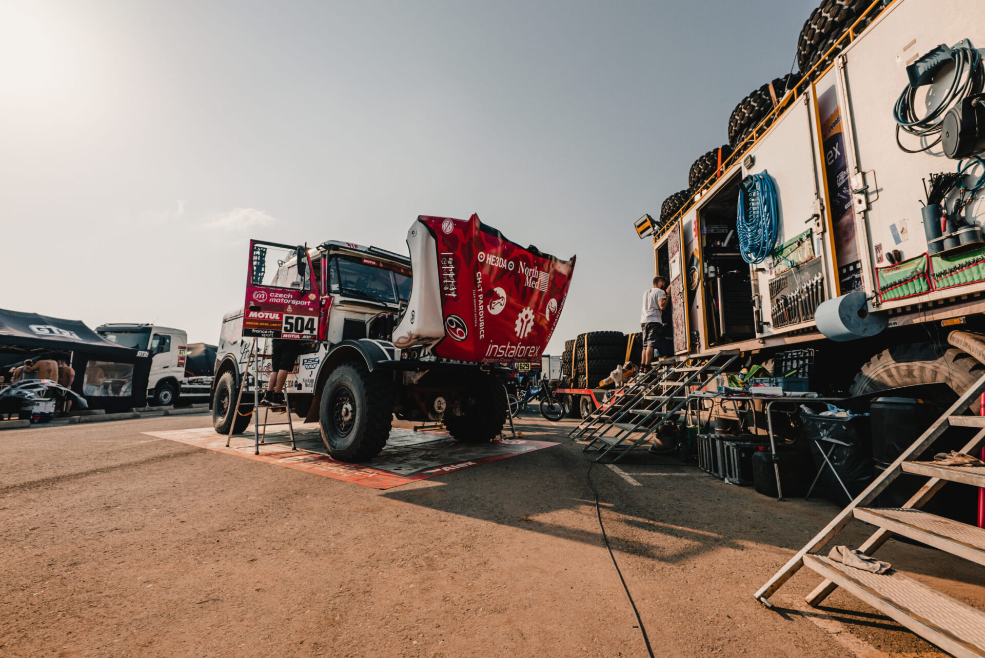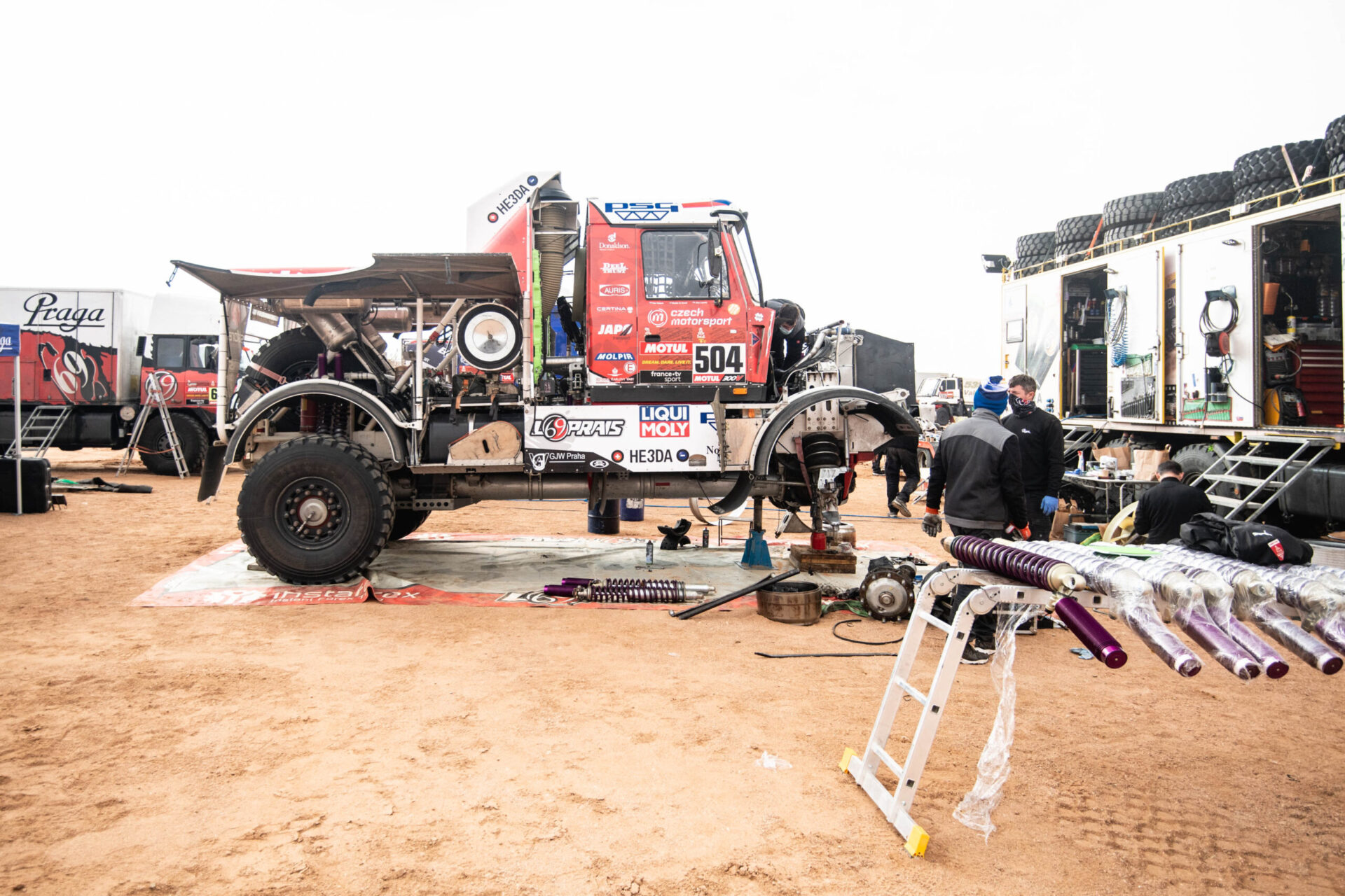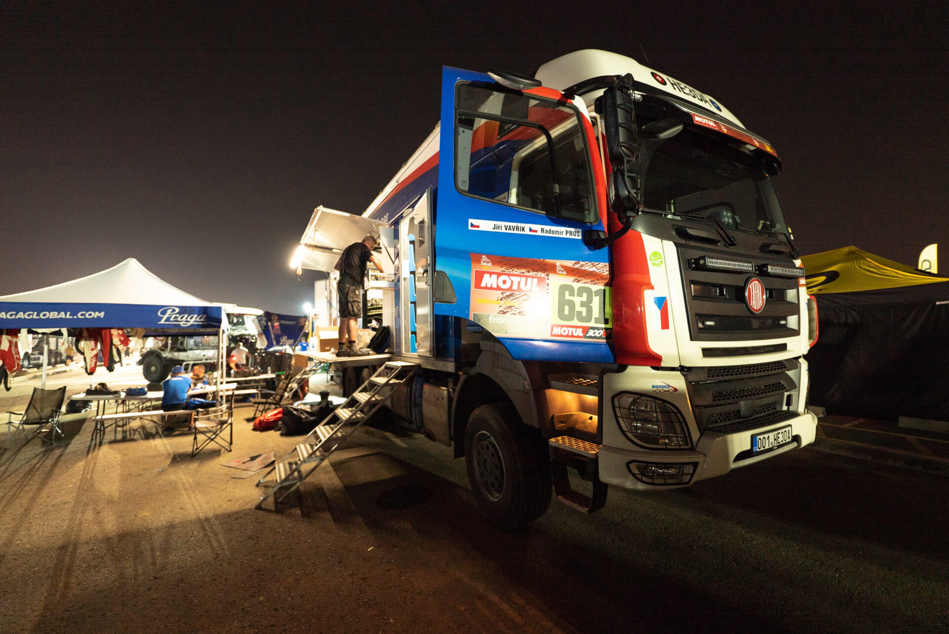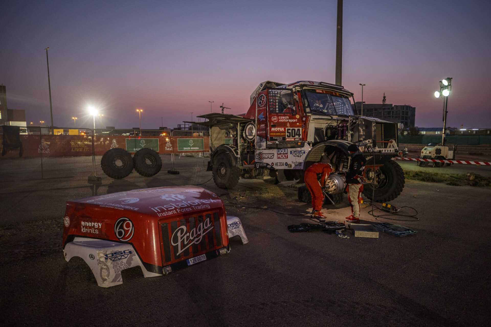 Co se dělo po příjezdu do včerejšího maratonského bivaku v Sakaka? Posádka týmu Big Shock! Racing se v rychlosti ubytovala ve velkém stanu na přistavených matracích a hned se vrhla do práce. Karel, jejich závodní kamion, prošel důkladnou kontrolou. „Zaměřili jsme se na spojovací tyč řízení, která v předchozí etapě dělala neplechu. Rozebírali jsme a znovu skládali jednotlivé části, abychom se přesvědčili, v jakém jsou stavu, ladili jsme i celou geometrii nastavení přední nápravy, opravovali utržený šroub na zadním diferenciálu, který způsoboval lehký únik oleje, měnili pneumatiky…,“ vyjmenovává palubní mechanik David Švanda.