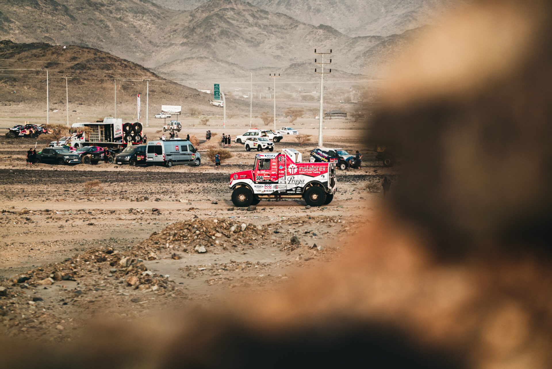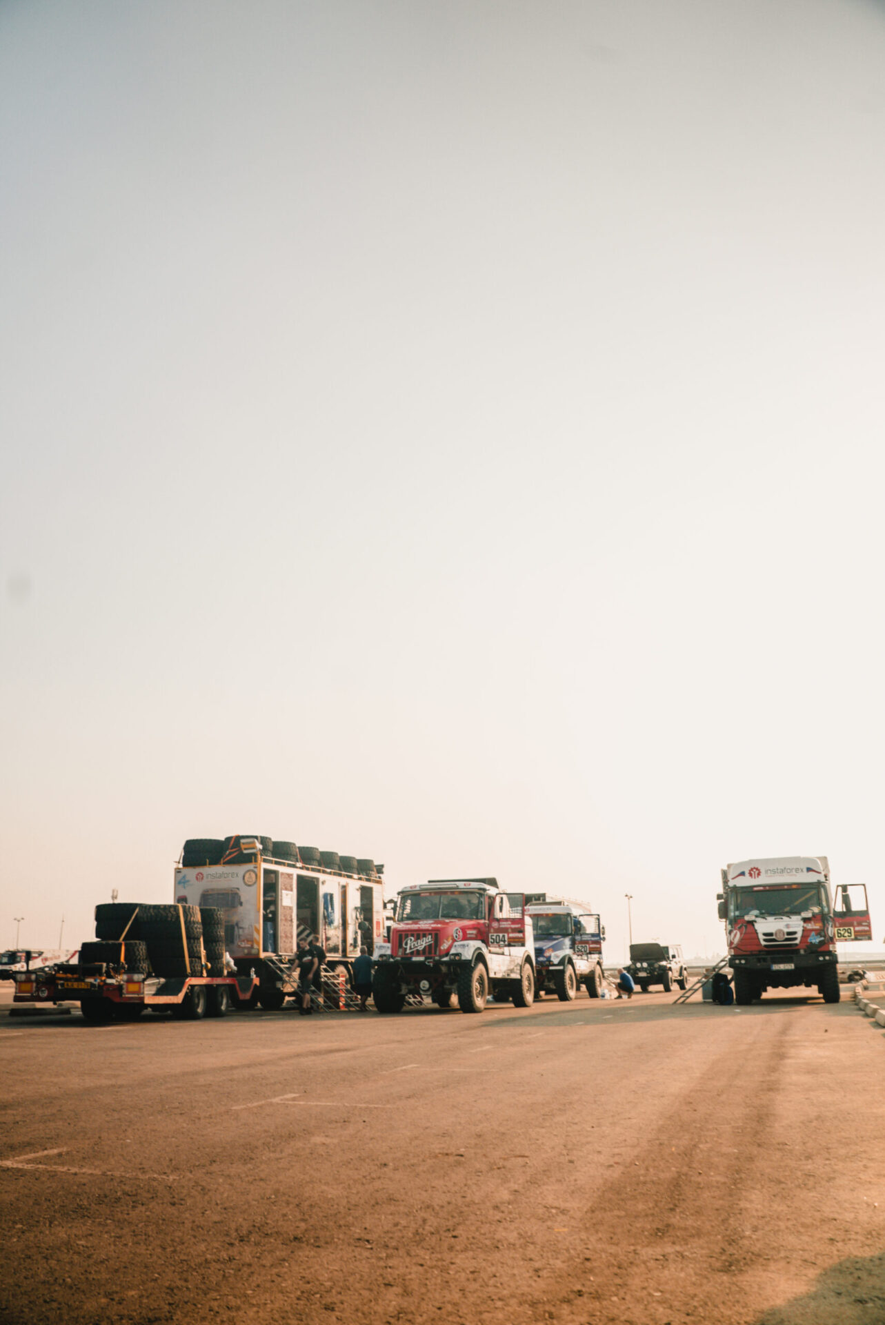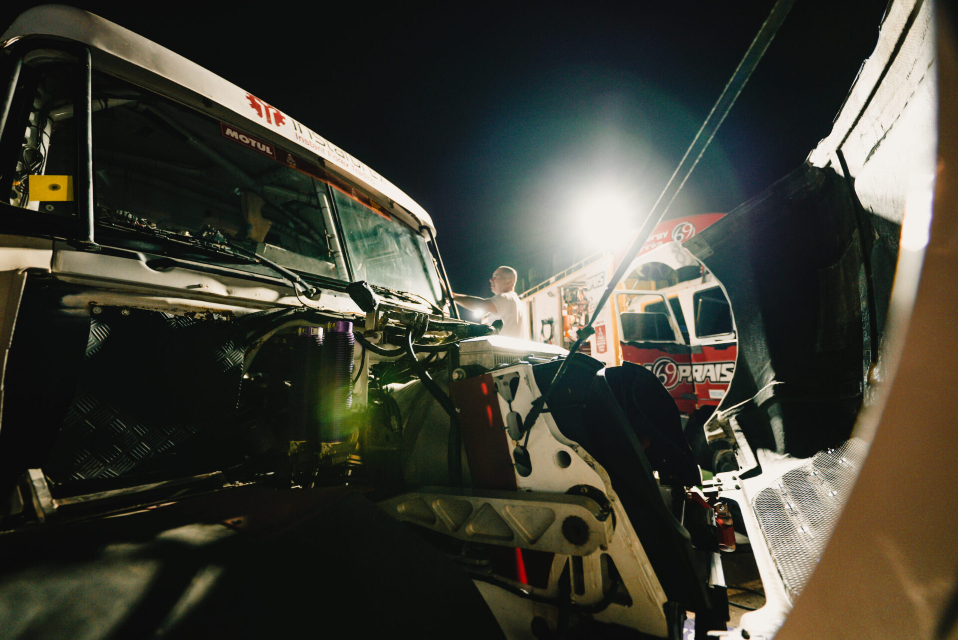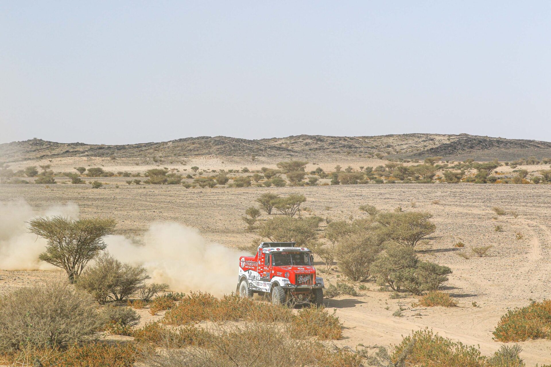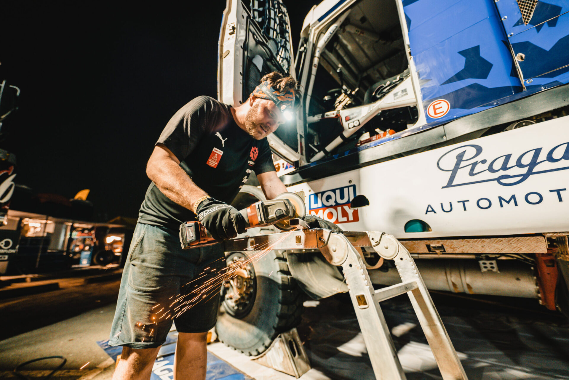 Co se dělo po příjezdu do včerejšího maratonského bivaku v Sakaka? Posádka týmu Big Shock! Racing se v rychlosti ubytovala ve velkém stanu na přistavených matracích a hned se vrhla do práce. Karel, jejich závodní kamion, prošel důkladnou kontrolou. „Zaměřili jsme se na spojovací tyč řízení, která v předchozí etapě dělala neplechu. Rozebírali jsme a znovu skládali jednotlivé části, abychom se přesvědčili, v jakém jsou stavu, ladili jsme i celou geometrii nastavení přední nápravy, opravovali utržený šroub na zadním diferenciálu, který způsoboval lehký únik oleje, měnili pneumatiky…,“ vyjmenovává palubní mechanik David Švanda.