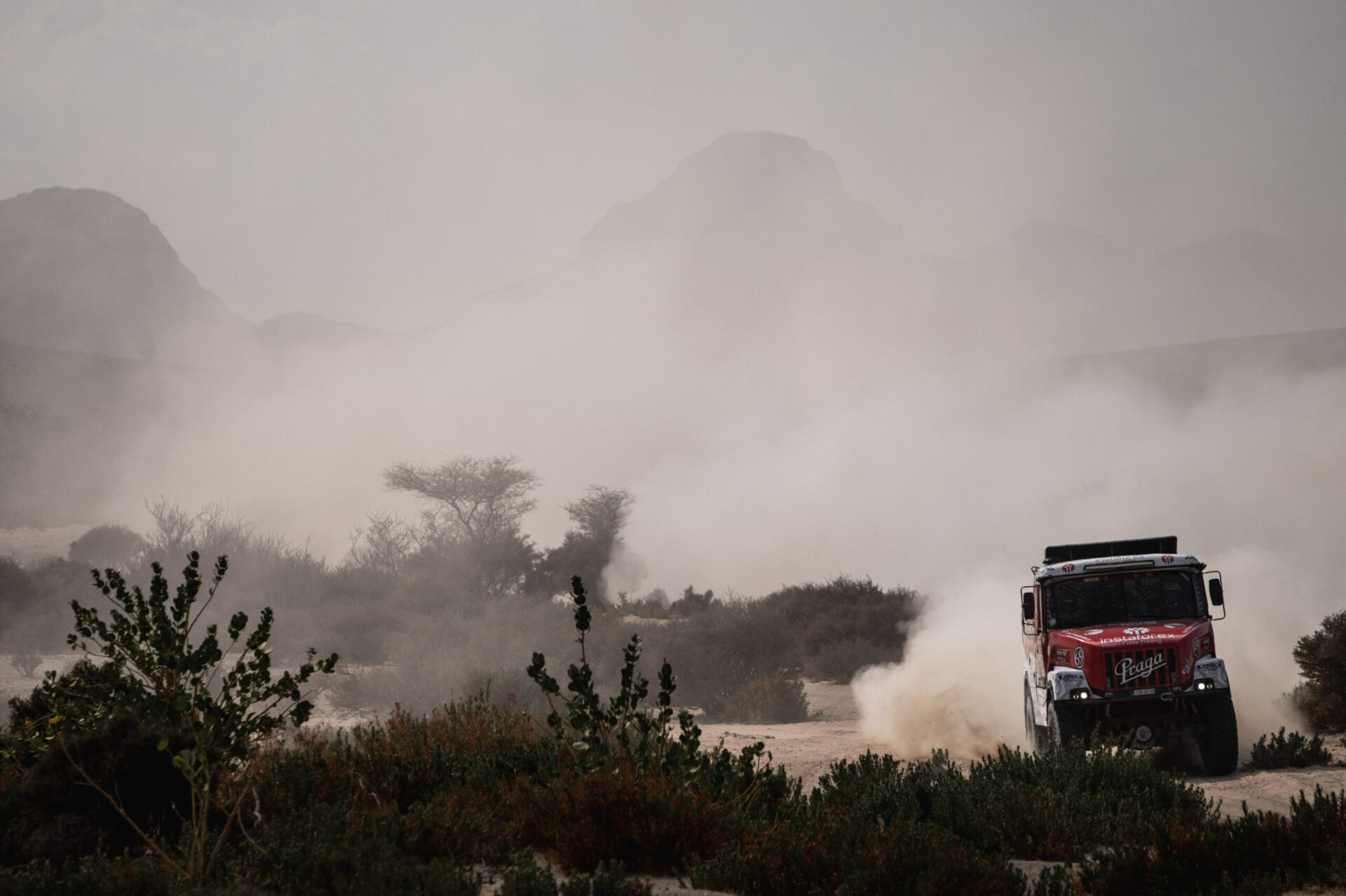 „Byla to velká rozbíječka. Díry, skoky, prach, kamení. Až posledních sto kilometrů bylo hezkých, protože se jelo písečným vádí mezi skalami,“ přibližuje Aleš Loprais.