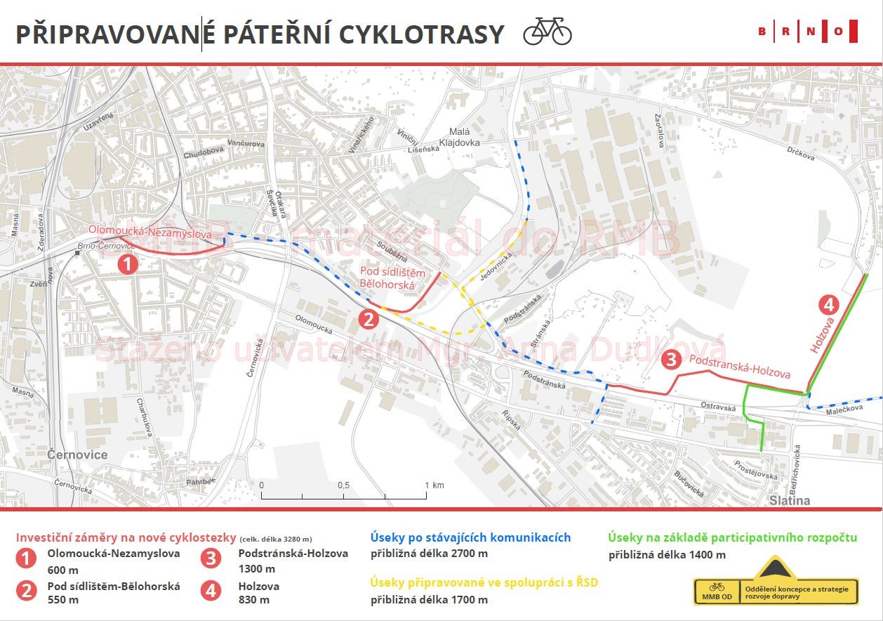 „Všechny schválené investiční záměry jsou součástí výstavby páteřních cyklotras, které povedou do jihovýchodní části města. Celkem se jedná o 3 280 metrů cyklostezek v oblasti Černovic, Líšně a Slatiny. Jednotlivé úseky jsou koordinovány s Ředitelstvím silnic a dálnic v rámci přípravy projektové dokumentace na VMO Ostravská radiála a také s vítězným projektem Cyklostezka do Líšně, který vzešel z participativního rozpočtu,“ uvedla primátorka města Brna Markéta Vaňková.