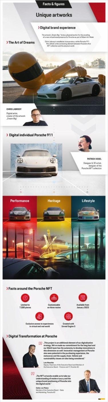 Společnost Porsche během veletrhu Art Basel v Miami zahajuje své počiny se značkou v digitálním světě a představuje svou první kolekci nezaměnitelných tokenů (NFT). Lutz Meschke, místopředseda představenstva a člen představenstva zodpovědný za finance a IT k tomu dodává: „Tento projekt je dalším prvkem naší strategie digitalizace. Zavázali jsme se k dlouhodobému vývoji a náš tým Web3 má autonomii při vývoji inovací i v této dimenzi. Řízení inovací ve společnosti Porsche vidí potenciál také v zážitku z nákupu, metaversu a dodavatelském řetězci. Zvažují se také otázky kolem vozidel a udržitelnosti.“