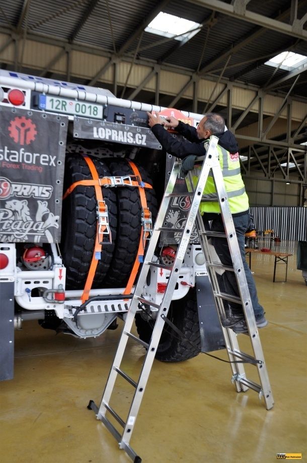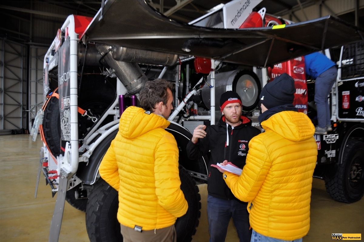 Při tréninku výměny kol si dá Loprais do těla společně s palubním mechanikem Petrem Pokorou, který absolvuje Dakar po boku frenštátského závodníka už popáté, a navigátorem Jaroslavem Valtrem mladším, jenž se v posádce pragovky objevuje podruhé.