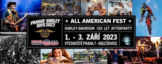 celou rodinu, silné stroje, moto vyjížďky, populární spanilou jízdu, výstavu motocyklů, adrenalin, koncerty a dobré jídlo a pití. V roce 2023 se mění na All American Fest a spojuje se s oblíbeným Burgerfestem a open-air podobou akce FMX Gladiator Games. Cílem akce je ukázat to nejlepší, co nám Amerika dala na poli zábavy, kultury, sportu, motocyklů, automobilů a gastronomie a představit nefalšovaný americký fesťák návštěvníkům v srdci Evropy, v Praze. All American Fest je díky svému širokému rozpětí určen skutečně pro každého, ať už přijede na motocyklu jakékoli značky, autem, tramvají nebo přijde pěšky, dorazí sám, s kamarády, rodiči nebo třeba s malými dětmi. www.allamericanfest.cz