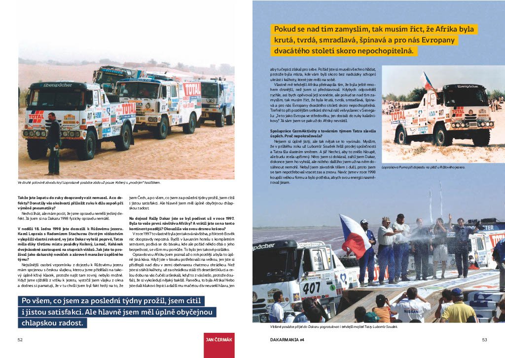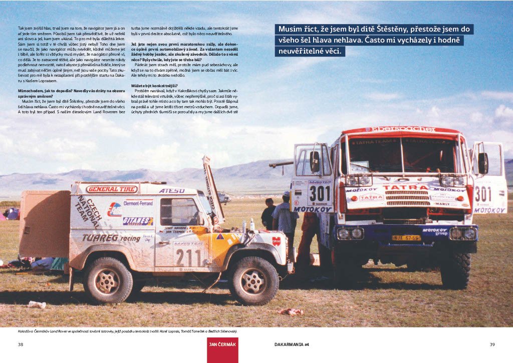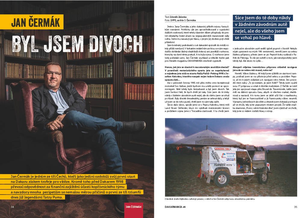 Píšeme o tom proto, že Jan Čermák je mj. fandou motoristického sportu, kde působil údajně i jako manager týmu a v roce 1998 byl dokonce členem vítězné posádky a navigátorem legendárního Karla Lopraise v jeho dakarské TATŘE.
