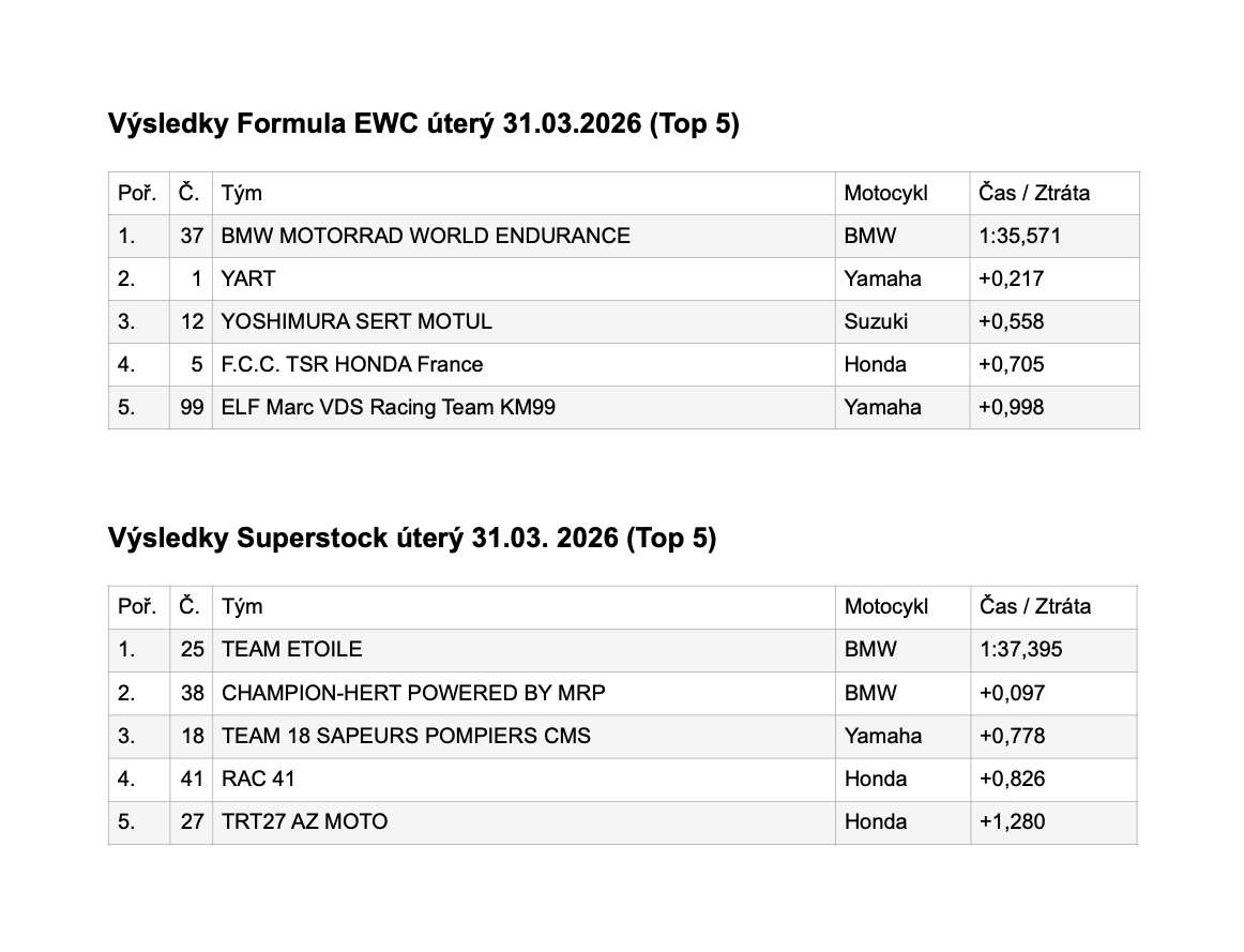 1. ročník mistrovství světa vytrvalostních motocyklů odstartuje již příští týden. Jeho první kolo se uskuteční 16. – 19. dubna v legendárním Le Mans. Před ostrým startem nové sezóny, ve které bude titul obhajovat rakouský tým YART Yamaha v sestavě s českým jezdcem Karlem Hanikou byly na programu dvoudenní testy. Na okruhu Bugatti (31. 3. – 1. 4. 2026) probíhala příprava na novou sezónu FIM EWC a ladila se technika na první závod. V centru pozornosti stál především úřadující mistr, tým Yamalube YART Yamaha, v jehož barvách nastoupil český jezdec Karel Hanika. Zatímco výsledkové listině dominoval belgický tovární tým BMW, YART se soustředil na precizní přípravu bez zbytečného riskování v honbě za nejrychlejším časem.