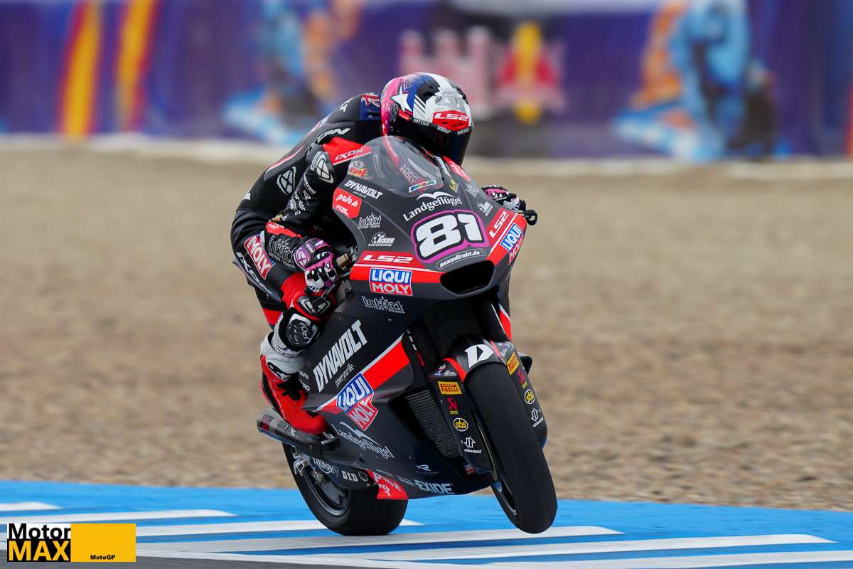 Prostřední kategorie Moto2 přinesla v Jerezu přepisování historických tabulek. Zpočátku udával tempo Barry Baltus, kterého následně na čele vystřídal Collin Veijer s časem, jenž chvíli platil jako nový rekord okruhu. V samotném závěru ale nasadil čerstvé pneumatiky Pirelli Senna Agius a posunul měřítka ještě dál. Jeho čas 1:38,973 mu zajistil první místo. Těsně za ním zaostal o pouhých 0,079 sekundy Alonso Lopez. Pátek naopak nevyšel Davidu Alonsovi, jenž ráno zdemoloval svůj motocykl Kalex-Triumph ve 13. zatáčce a skončil celkově devátý.